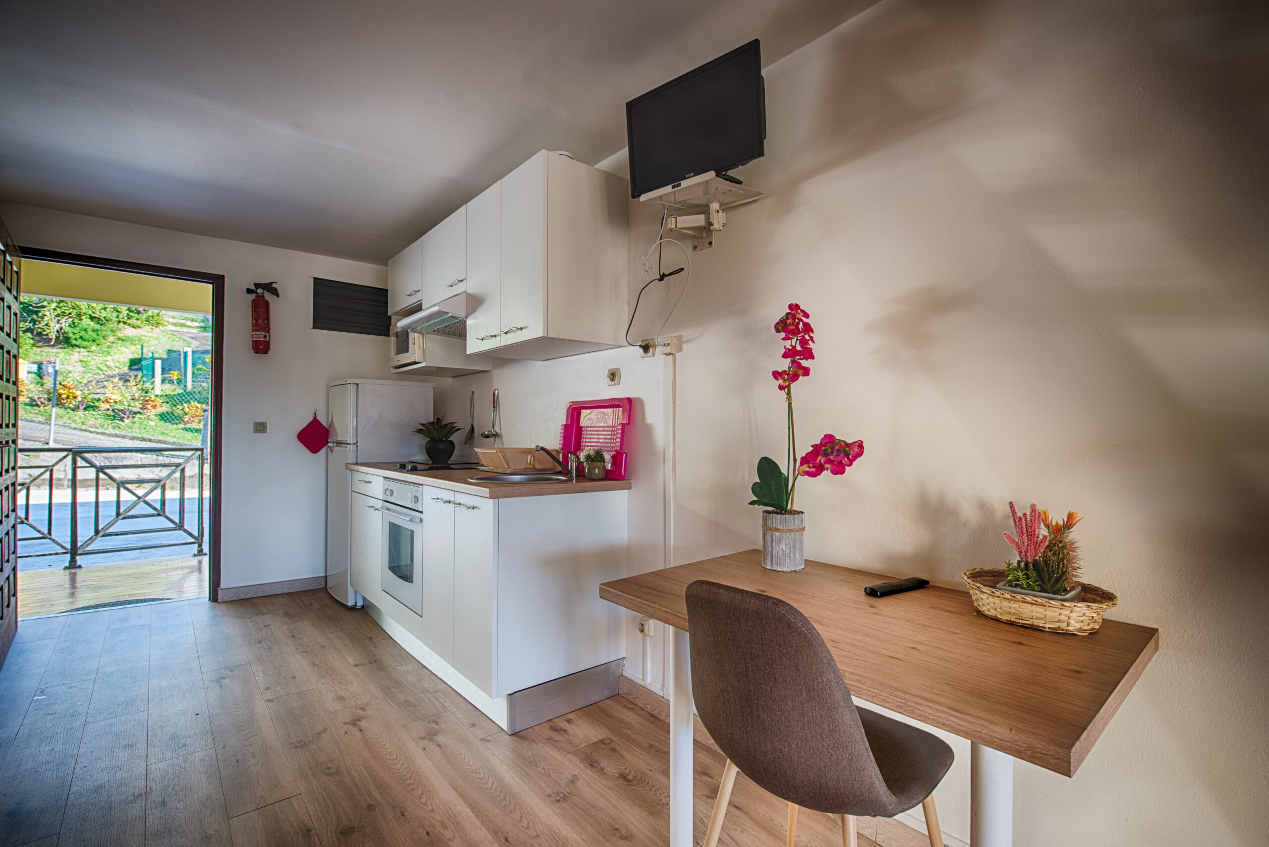 • Cuisine équipée : réfrigérateur, plaque de cuisson, micro-ondes, ustensiles